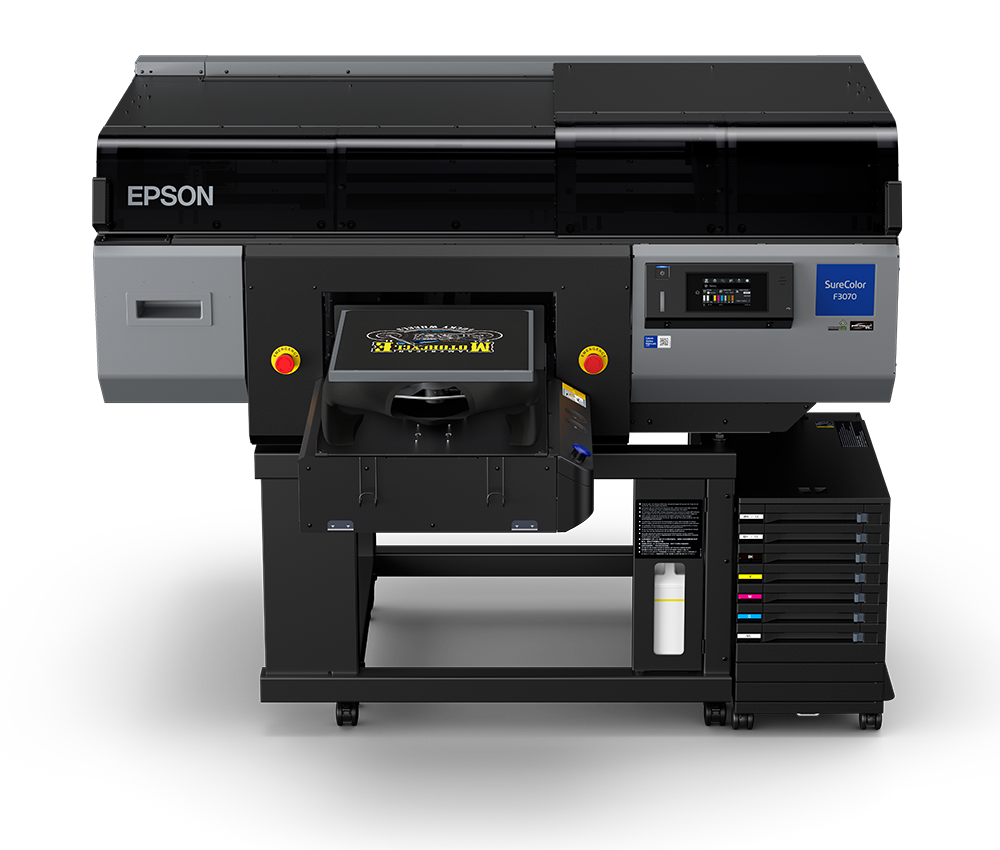 Bring a new level of productivity and efficiency to your printing business with the all-new SureColor F3070 industrial direct-to-garment printer. The first of its kind to meet the demanding needs of high-production print shops, the F3070 was built from the ground up to deliver professional-quality, one-pass prints at industrial-level speeds. Featuring automatic garment thickness adjustment, easy user maintenance features and a new dual 2.6″ PrecisionCore® printhead, this innovative direct-to-garment printer maximizes productivity and reduces downtime for fast, cost-effective print production. Coupled with the first bulk ink system integrated into an Epson® direct-to-garment printer, the F3070 can produce a full-size t-shirt in moments, allowing print shops to print hundreds of shirts per day, all at a remarkably low cost of ownership.