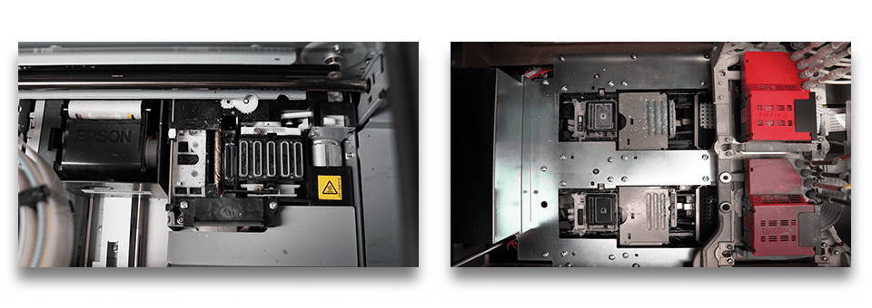 The Epson F2100 performs an automatic cleaning every 5 operational hours. This process will take about 5-6 minutes in total. For daily maintenance, simply pressing the power button off will start an automatic cleaning process. Cleaning solution will be circulated and the printer will be fresh and ready for the next day. Weekly maintenance only takes about a minute and involves supplying the lines with a cleaning solution and then cleaning the capping station.