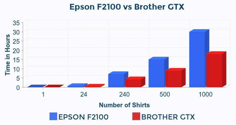 When it comes to cost for DTG printers, the biggest factor will always be ink. The more regularly that you have to purchase ink, the more expensive your overhead will be. With this in mind, the Epson F2100 uses 10% less ink than the Brother GTX and the inks have a shelf life of a little over a year. This means you won’t have to frequently replace ink that you aren’t using for this printer.
